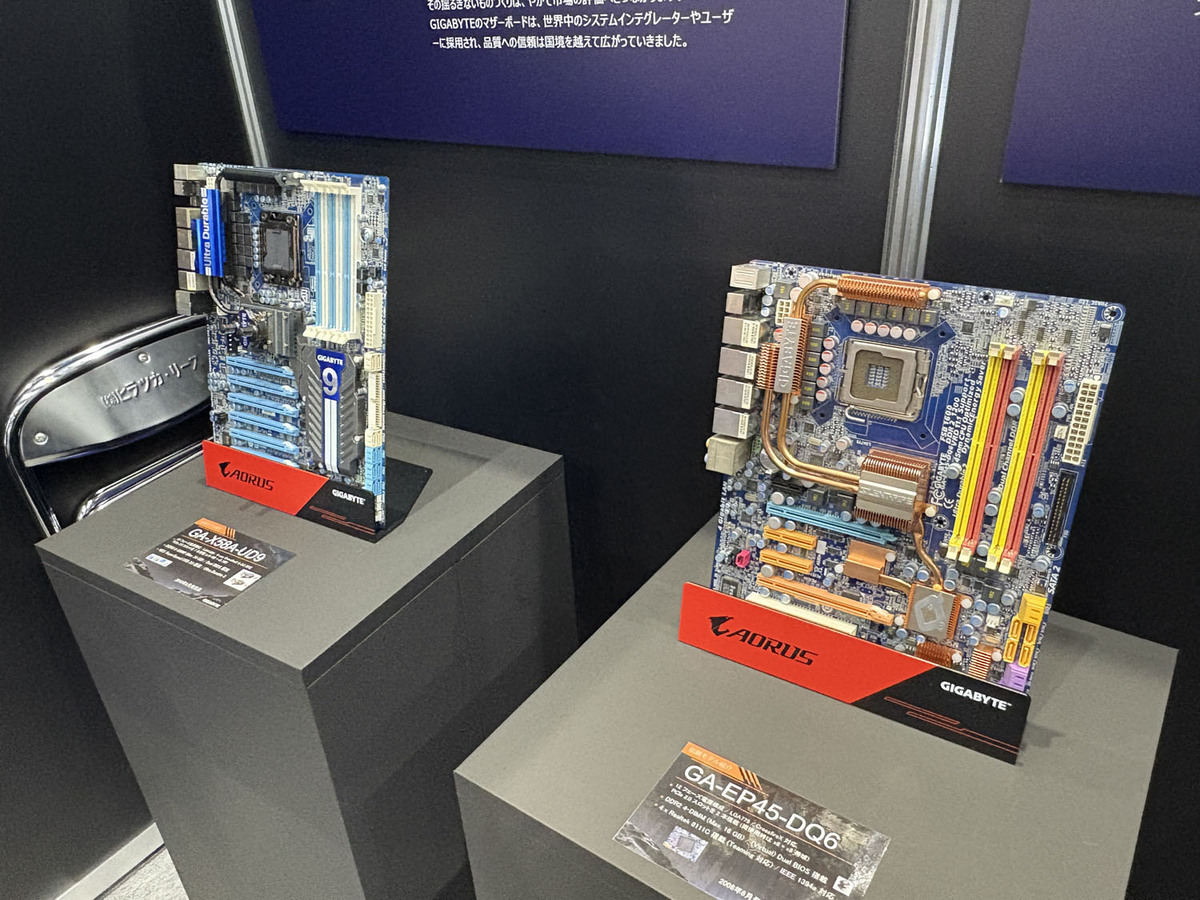 同社の伝説的マザーボードGA-X58A-UD9(左)とGA-EP45-DQ6(右)。古参の自作マニアは心を奪われる展示だ