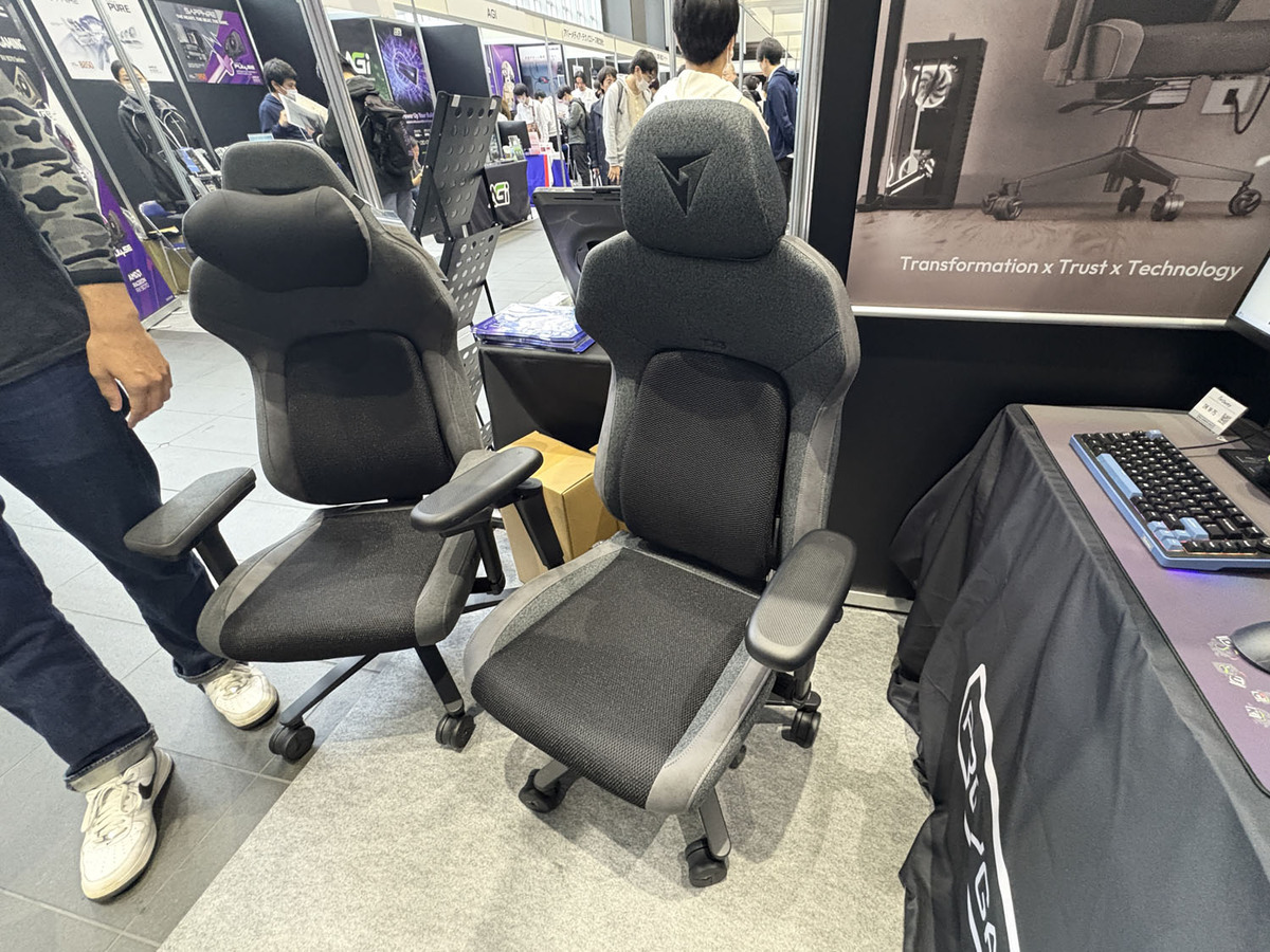 ThundeX3のゲーミングチェアCORE 360を参考出展。可動式のランバーサポートを搭載するため、体を捻っても体にフィットする仕様。さらに従来モデルのCORE Smartにはなかった上下の可動域が追加されている