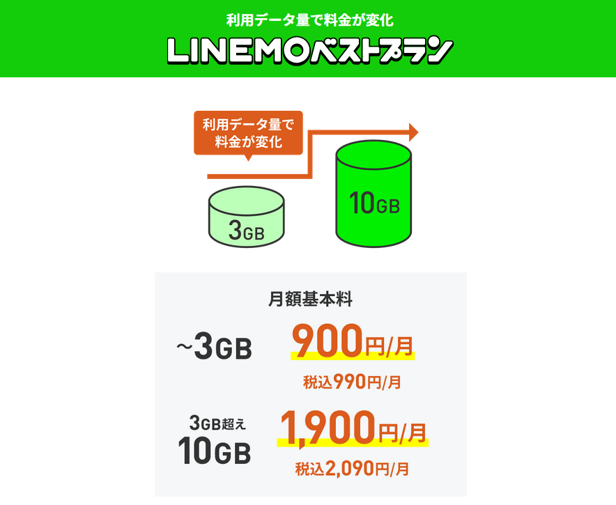 「ベストプラン」は月990円で3GBと格安SIMの中ではギガはやや少なめですが、3GBをオーバーした場合はプラス1100円で10GBまで使えます。また、LINEとの連携機能があり、LINEのトークや音声・ビデオ電話ではギガが減らないのもうれしい点です。