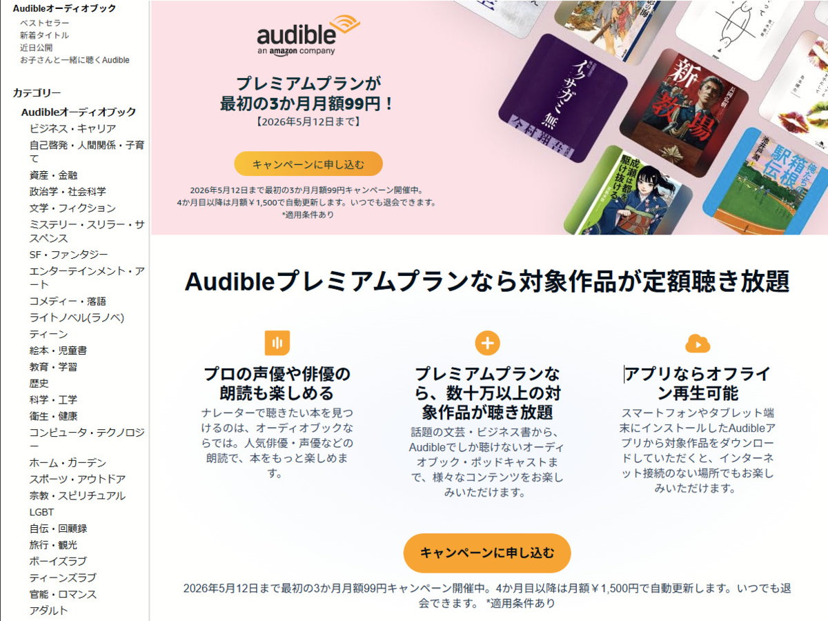 月額1500円で「Audible」のプレミアム会員になると、数十万にもおよぶ作品が聴き放題となり、さらにお得な会員価格で単品購入もできるように。2026年5月12日までは、最初の3ヵ月間が月額99円で利用できるキャンペーンも実施中。