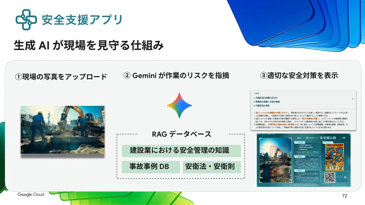 この課題に対して開発されたのが安全支援アプリだ。使い方はシンプルで、現場で作業中の写真をアップロードするだけ。Geminiが画像を認識し、どんな作業が行われているか、現場がどういった状況かを把握した上で、RAGデータベース化された安全管理の知識や事故事例、安全関連法令を参照して適切な安全管理を提示する。レスポンスまでの所要時間は約60秒だ。