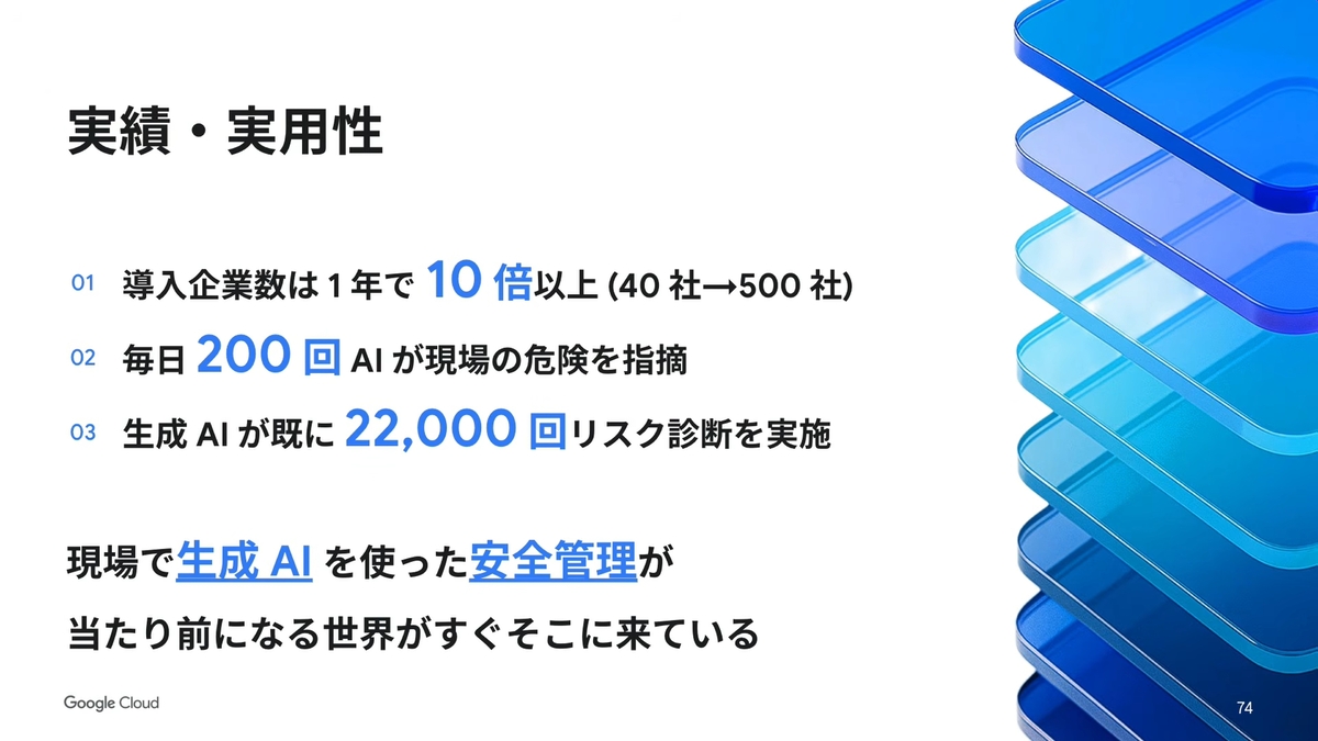提供開始から約1年半で500社以上に利用され、1年間で利用者数は10倍以上に伸びた。毎日200回以上、このアプリを通じてリスクの指摘が行なわれている。大手建設会社の西松建設では、毎朝のKY(危険予知)活動の中で安全支援アプリを活用。前日の現場写真からAIがリスクを洗い出し、サイネージに表示しながら現場監督と作業員が指差し確認をしているという。