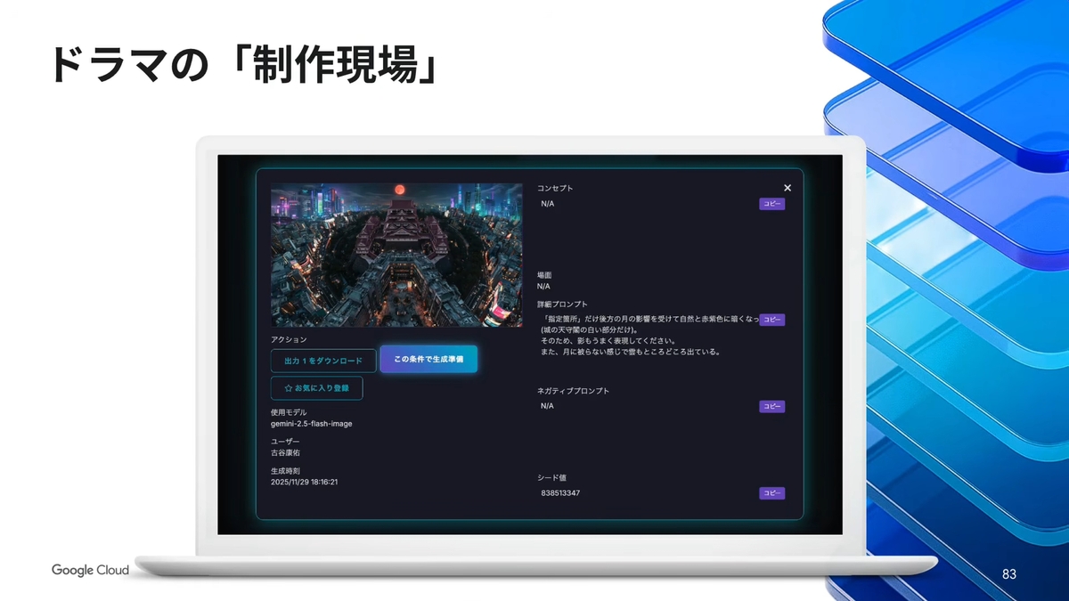 古谷氏は「AIチーフクリエイター」という肩書きで、制作チームの演出意図をAIチームやCGチームに橋渡しする役割を担った。テキストや画像から動画を生成する自社開発ツールを使い、ドラマのカットを1つ1つ作り上げていった。同じテキスト、同じ画像から大量に動画を生成するツールも自社で開発。AIクリエイターやAIエンジニア、演出陣が会議室に集まり、その場でAIカットを作り上げる高密度な環境を構築した。新人や学生アルバイトでもプロのクリエイティビティを即座に形にできる仕組みだったという。