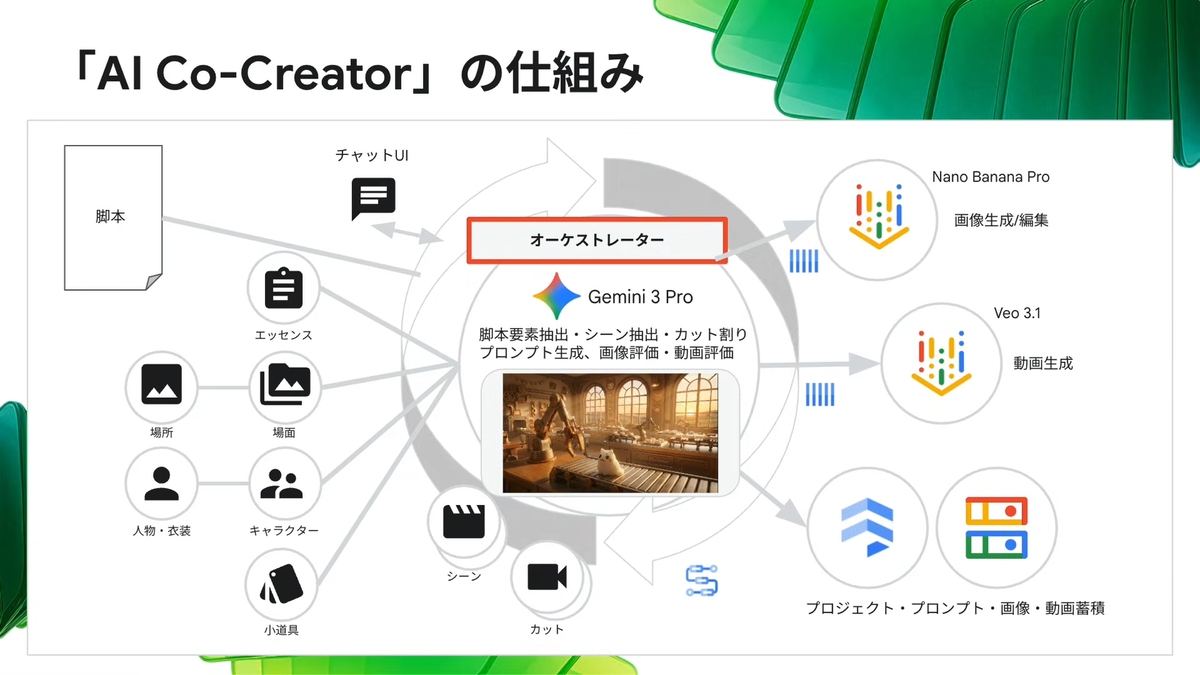 さらに、生成された動画をAI自らが評価し、表情の不自然さやライティングの修正案を提示してくれる機能も備えている。Geminiがオーケストレーターとなり、複数のAIエージェントが技術系エージェントとして連携する構成だ。