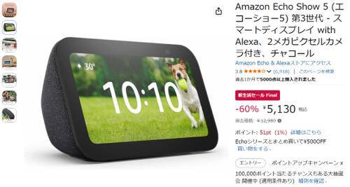 Amazonのスマートディスプレイ「Echo Show 5(第3世代)」がAmazon新生活セール Final対象。過去価格12,980円のところ、60%オフの5,130円で販売中。
