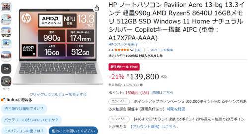 HPの13.3インチノートPC「Pavilion Aero 13-bg(A17X7PA-AAAA)」が、Amazon新生活セール Final対象。参考価格176,000円のところ、21%オフの139,800円で販売中。