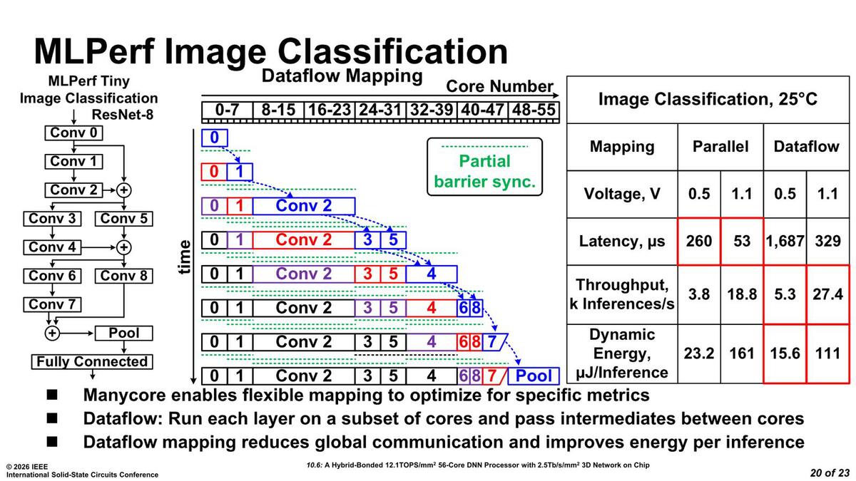 ところがDataflowでは下の画像の処理ができる。インテルのケースではコアの数が56個と少ないので、Dataflow式にするとレイテンシー(最初にデータを入れてから結果が出てくるまでの時間)こそやや長くなっているが、スループットや効率ではDataflowの方が優れているという結果になっている。