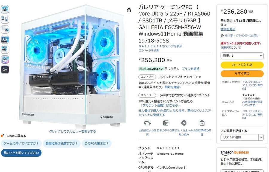 Amazon.co.jpにて、GALLERIAのゲーミングデスクトップPC「GALLERIA FGC5M-R56-W」が販売中だ。価格は25万6280円。