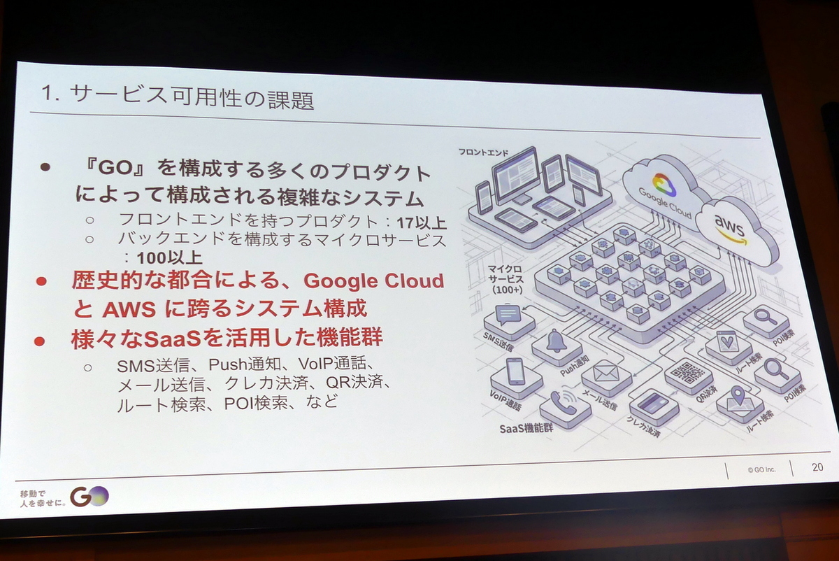 こうした背景があるため、サービスの可用性はつねに大きな課題だという。「GO」は多くのプロダクトによって構成された複雑なシステムとなっており、フロントエンドを持つプログラムだけで17以上、バックエンドを構成するマイクロサービスは100以上に及ぶ。それに加え、事業統合した歴史的な経緯から、利用しているクラウドがAWSとGoogle Cloudにまたがっているという事情がある。「これは冗長化ではなく、単純に2つ使っているという状態なので、SLAがかけ算で悪くなってしまう」と惠良氏は語る。