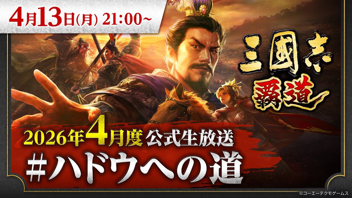 コーエーテクモゲームスは4月6日、iOS/Android/PC(Steam/Google Play Games)でサービス中のMMO戦略シミュレーションゲーム『三國志 覇道』について、生放送番組「『三國志 覇道』4月度公式生放送 #ハドウへの道」の実施が決定したと発表。配信日は、2026年4月13日21時より。