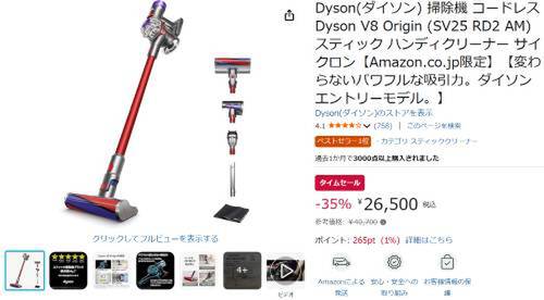 Dysonのコードレス掃除機「Dyson V8 Origin(SV25 RD2 AM)」がAmazonタイムセール対象。参考価格40,700円のところ、35%オフの26,500円で販売中。
