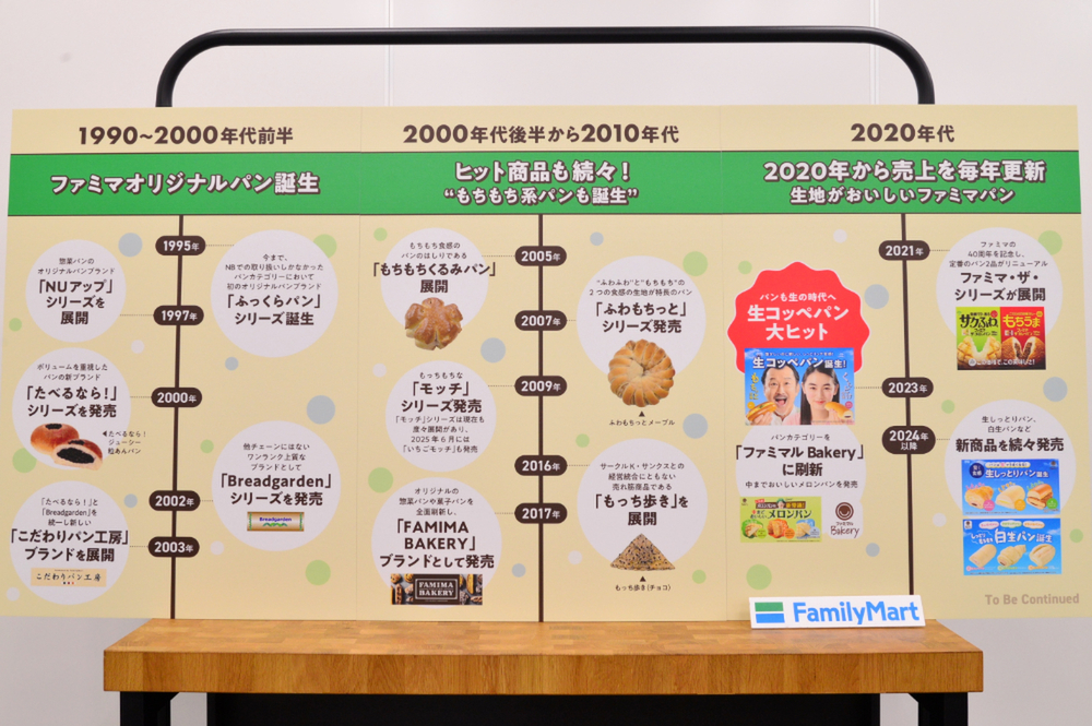 2026年の9月に創立45周年を迎えるファミリーマートですが、パンは注力しているカテゴリーのひとつであり、商品発表会・試食会では記念のパン年表も披露されていました。いやぁ、こうして見ると近年だけでも大作が次々と登場してますね。