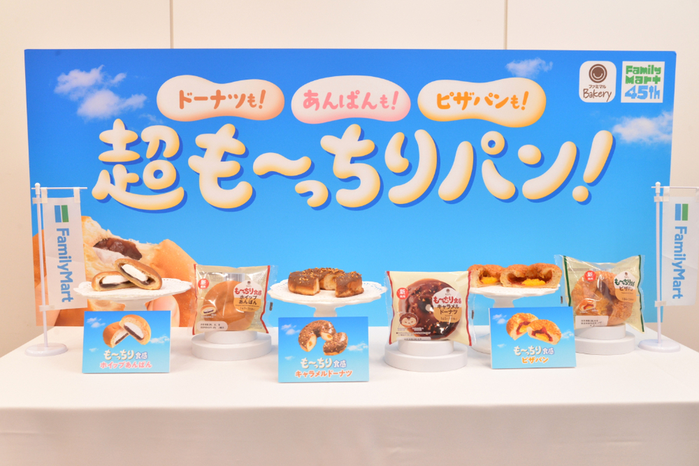 新シリーズは、その名も「超も~っちりパン」。具体的には「も~っちり食感キャラメルドーナツ」(178円)、「も~っちり食感ホイップあんぱん」(158円)、「も~っちり食感ピザパン」(198円)の3種類が4月7日発売します。