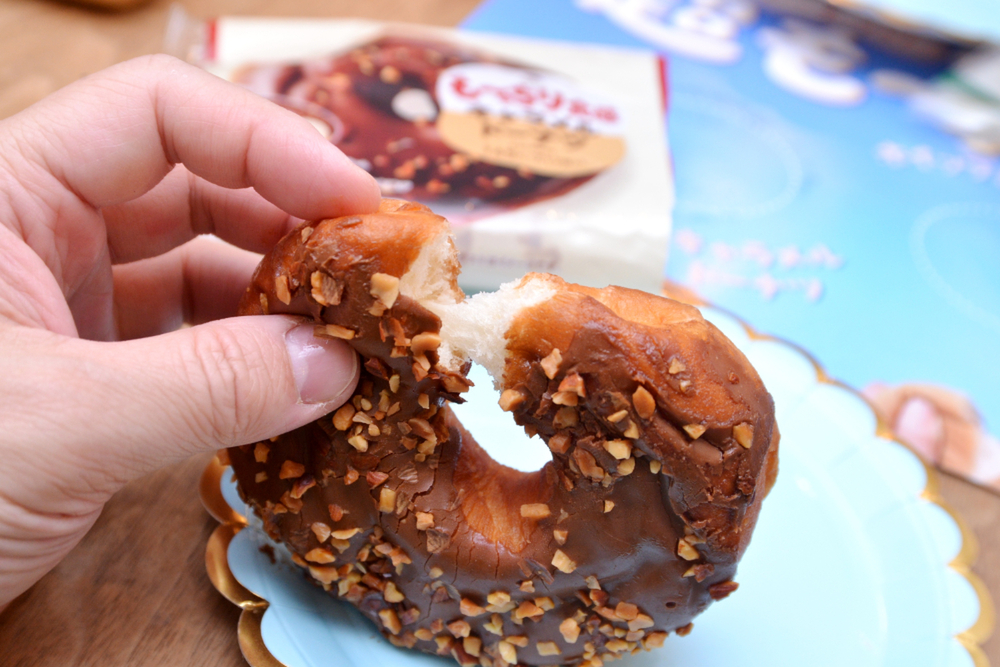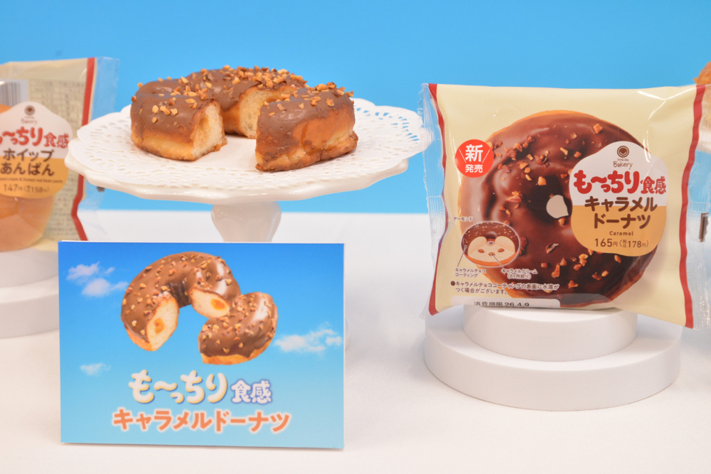 そして、社内では人気No.1だったという「も~っちり食感キャラメルドーナツ」。こちらは前例にない量のでんぷんを配合し、みずみずしい弾力を表現したとか。ちなみに「でんぷんとは具体的に何ですか?」と聞いたところ、タピオカでんぷん、ジャガイモでんぷん、トウモロコシでんぷんなどで、米粉は今回使ってないそうです。