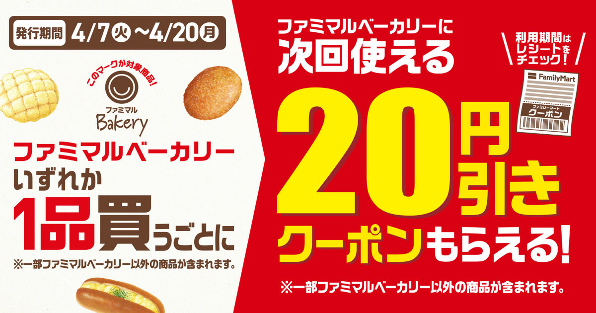 ひとつは、「ファミマルベーカリー」のパンいずれか1品買うごとに、「ファミマルベーカリー」のパン全品に次回使える20円引きレシートクーポンがもらえること(ただし、沖縄県では実施していません)。