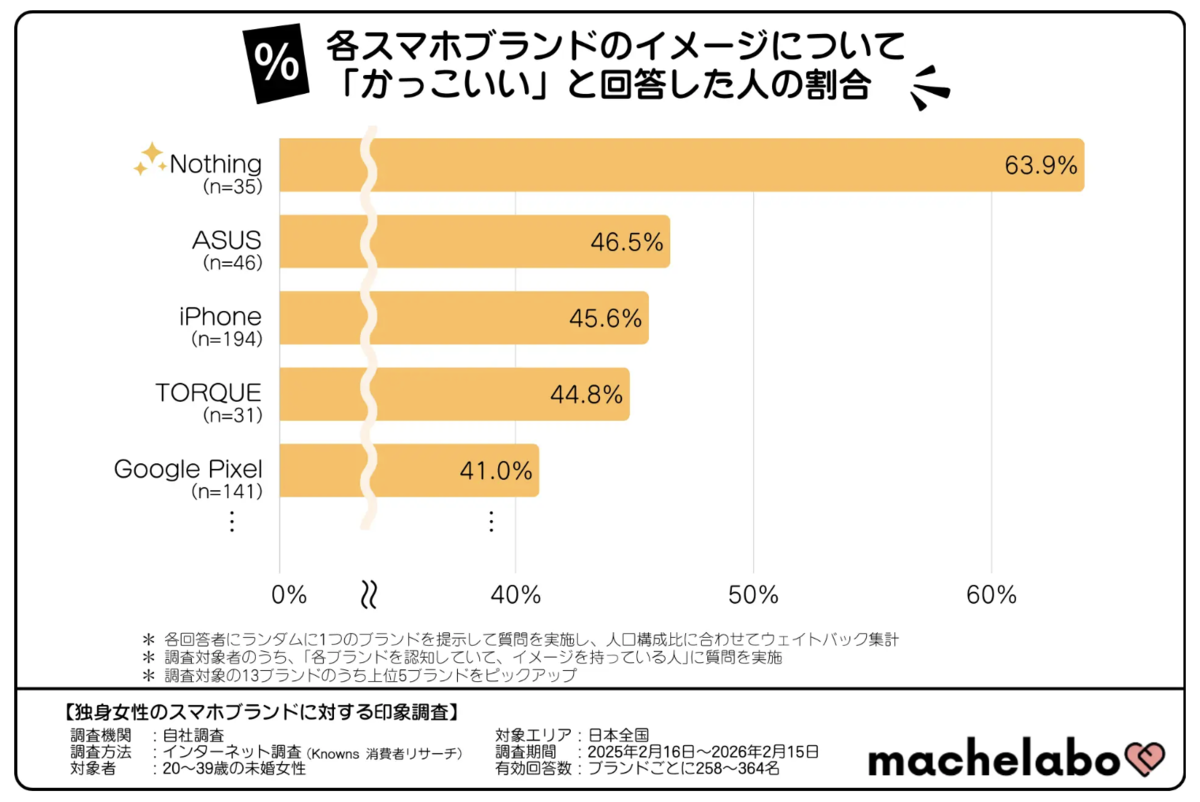 そのブランドとは、ズバリ「Nothing」だ。63.9%で1位となり、2位の「ASUS」(46.5%)に17ポイント以上の差をつけている。Nothingはイギリスに拠点を置くブランドで、透明なパネルやLEDを用いた独自のデザインが特徴的。他にないデザインが、強い印象を与えているのだろうか。