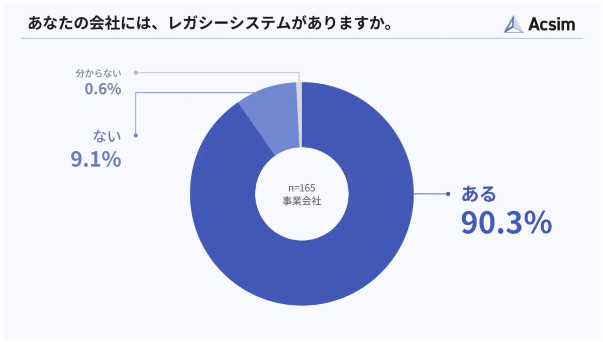 まず、自社にレガシーシステムが存在するかを尋ねたところ、「ある」と回答した企業は90.3%にのぼり、大多数の企業が刷新対象を抱えている実態が明らかとなりました。