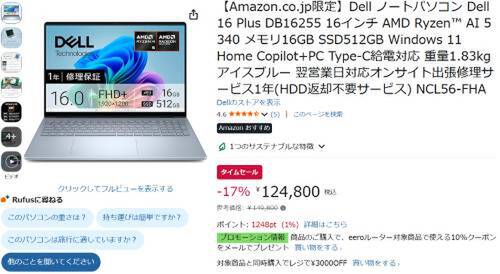 Dellのノートパソコン「Dell 16 Plus DB16255(NCL56-FHA)」がAmazonタイムセール対象。参考価格149,800円のところ、17%オフの124,800円で販売中。