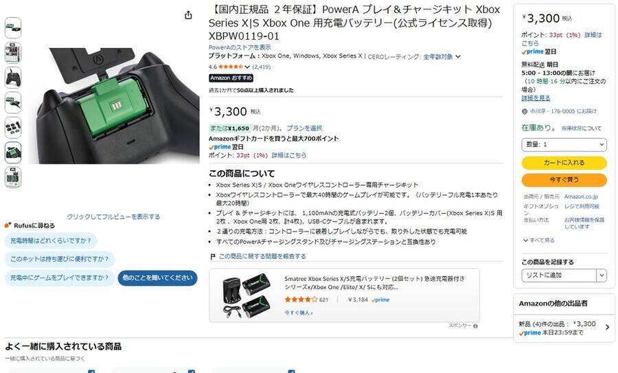 Amazon.co.jpにて、PowerAの「Xbox Series X|S Xbox One 用充電バッテリー」が販売中だ。価格は3300円。