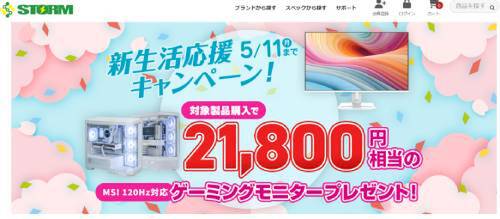 STORMでは現在、「新生活応援キャンペーン」を実施中。期間は5月11日まで。対象モデルを購入すると、27インチ・120Hz対応のゲーミングモニター「MSI PRO MP275W E2」をプレゼント中。