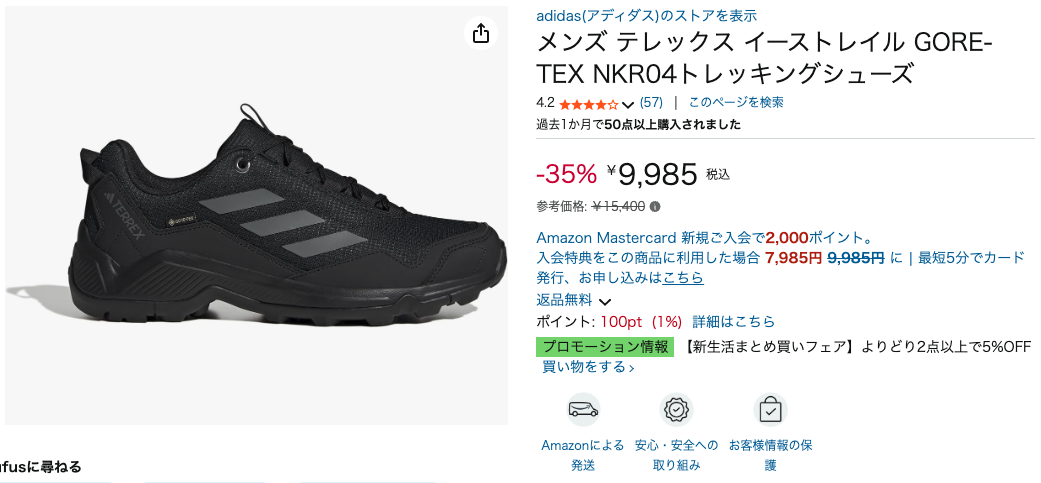 アディダスのTERREX EASTRAIL GTXが、Amazonで35%OFFの9,985円で販売されています!