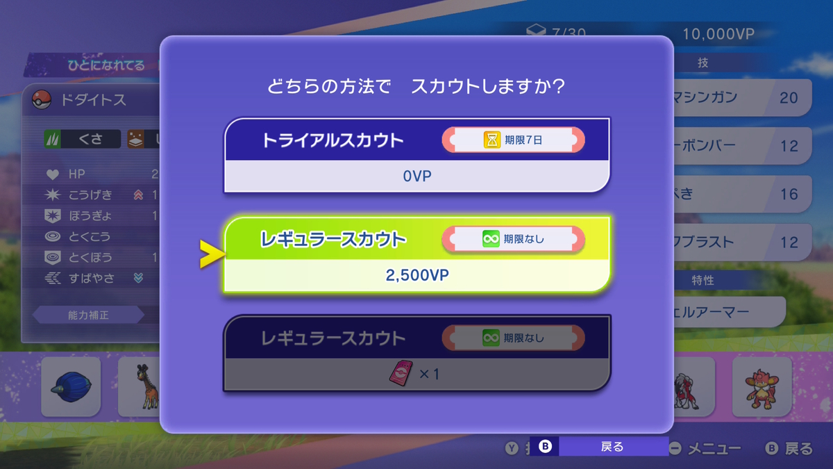 ただし、トライアルスカウトしたポケモンも後からレギュラーに更新できることを確認したので、VPが貴重な序盤はとりあえずトライアルでスカウトしておくといいかもしれない。