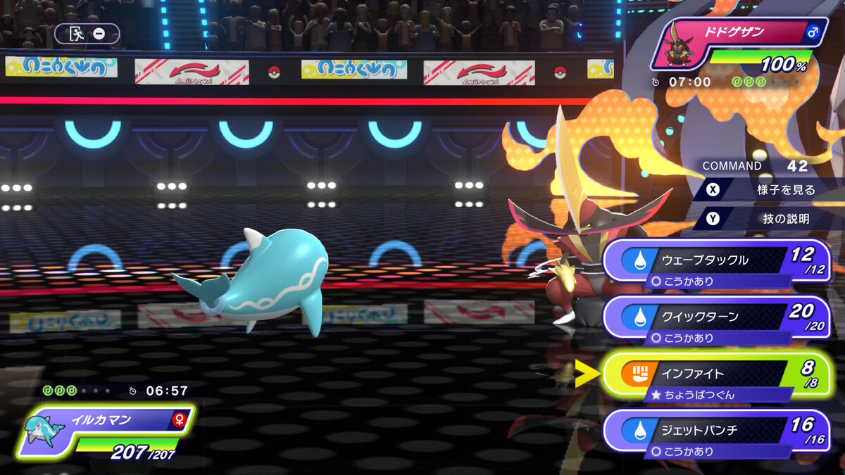 ポケモンバトルは対人戦なので、1ターンあたりのコマンドを選ぶ制限時間がある(45秒)。ただ技ごとのタイプ相性はひと目で分かるようになっているため、テンポ良くバトルを進められると感じた。