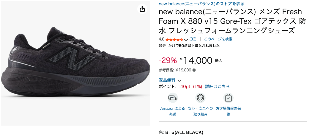 そこで注目したいのが、ニューバランスのFresh Foam X 880 v15 Gore-Tex。Amazonで29%OFFの14,000円で販売されています。