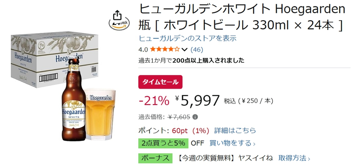 現在開催中のAmazonタイムセールでは、「ヒューガルデンホワイト Hoegaarden 瓶 330ml×24本」が21%オフになっています。