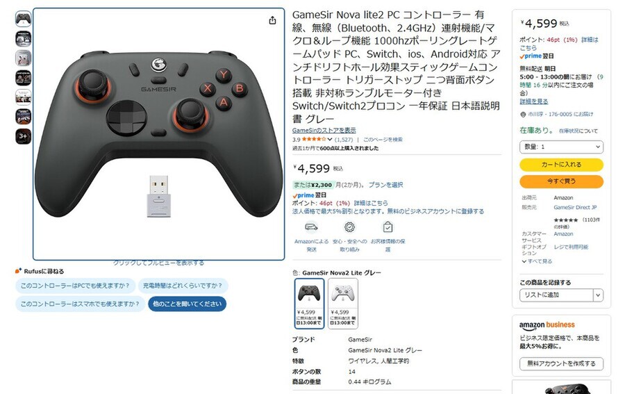Amazon.co.jpにて、Nintendo Switch 2・PC・モバイルに対応するコントローラー「GameSir Nova lite2」が販売中だ。価格は4599円。