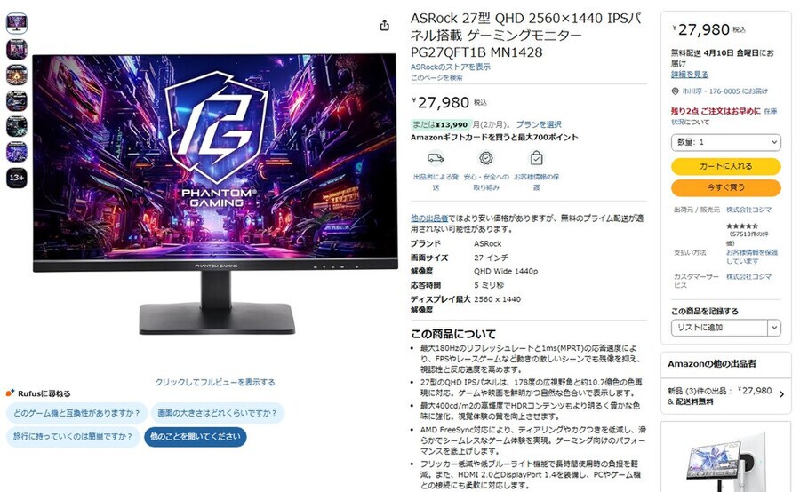 Amazon.co.jpにて、ASRockの27型ゲーミングディスプレー「PG27QFT1B MN1428」が販売中だ。価格は2万7980円。