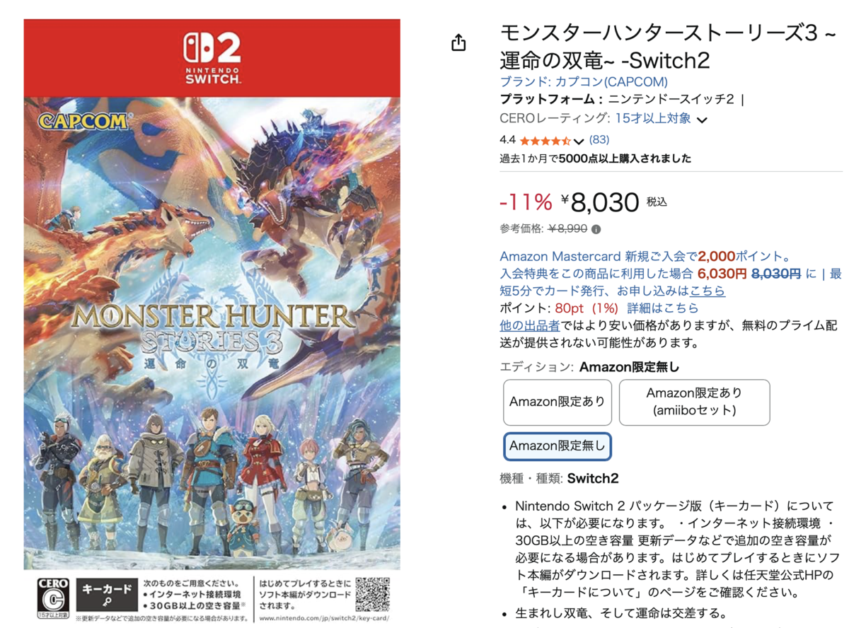 というわけで、今回はクリア後の感想も交えながら、「モンスターハンターストーリーズ3 ~運命の双竜~」を再び紹介。AmazonではSwitch 2版が参考価格が8,990円のところ、11%オフの8,031円で購入できます(4月8日現在)。