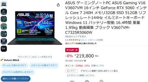 ASUSのゲーミングノートPC「Gaming V16 V3607VM」がAmazonタイムセール対象。参考価格239,800円のところ、8%オフの219,800円で販売中。