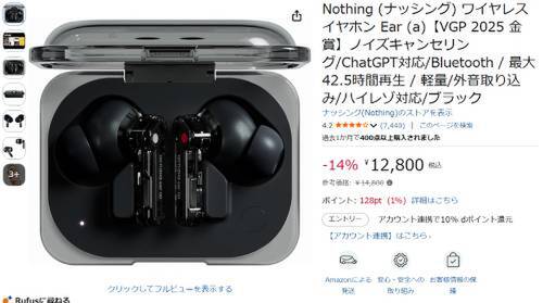 Nothingのワイヤレスイヤフォン「Ear (a)」がAmazonで割引対象。参考価格14,800円のところ、14%オフの12,800円で販売中。