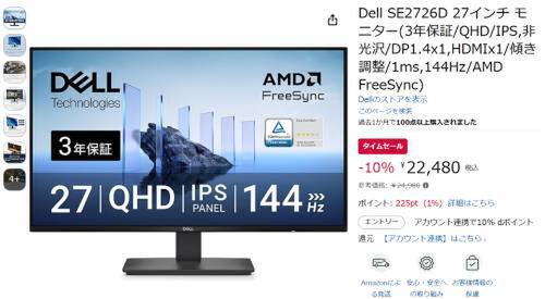 Dellの27インチモニター「SE2726D」がAmazonタイムセール対象。参考価格24,980円のところ、10%オフの22,480円で販売中。