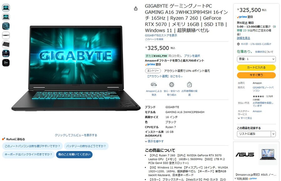Amazon.co.jpにて、GIGABYTEの16型ゲーミングノートPC「GAMING A16 3WHK3JP894SH」が販売中だ。価格は32万5500円。