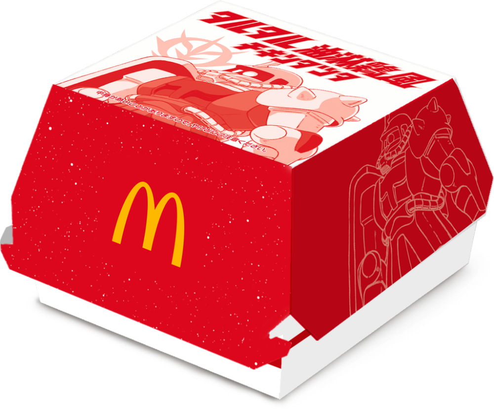 シリーズ商品は「機動戦士ガンダム」とのコラボデザインのパッケージ(数量限定)で提供されます。バーガー3種、マックフィズ/フロートで異なるパッケージを展開。ガンダム、アムロ、シャア、シャア専用ザクⅡなどが描かれています。