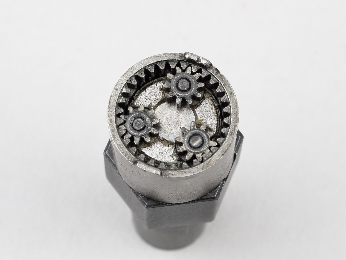 基本は、プラネタリー型遊星歯車機構を使った減速のようです。これは、中心の歯車で周囲の遊星歯車を回し、その遊星歯車が内歯車に当たってゆっくり回ることで減速する、というもの。