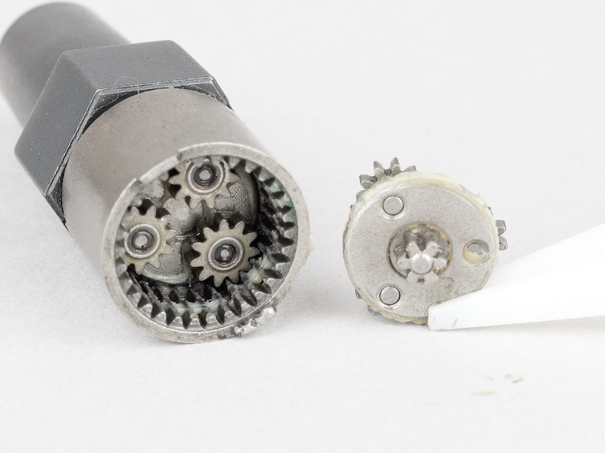 これを3段重ねることで、中心軸をずらさず、小さくても安定した回転と高いトルクを実現しているわけですね。この手のギヤボックスは分解したことがなかったもので、実物を見るとなかなか興味深いです。