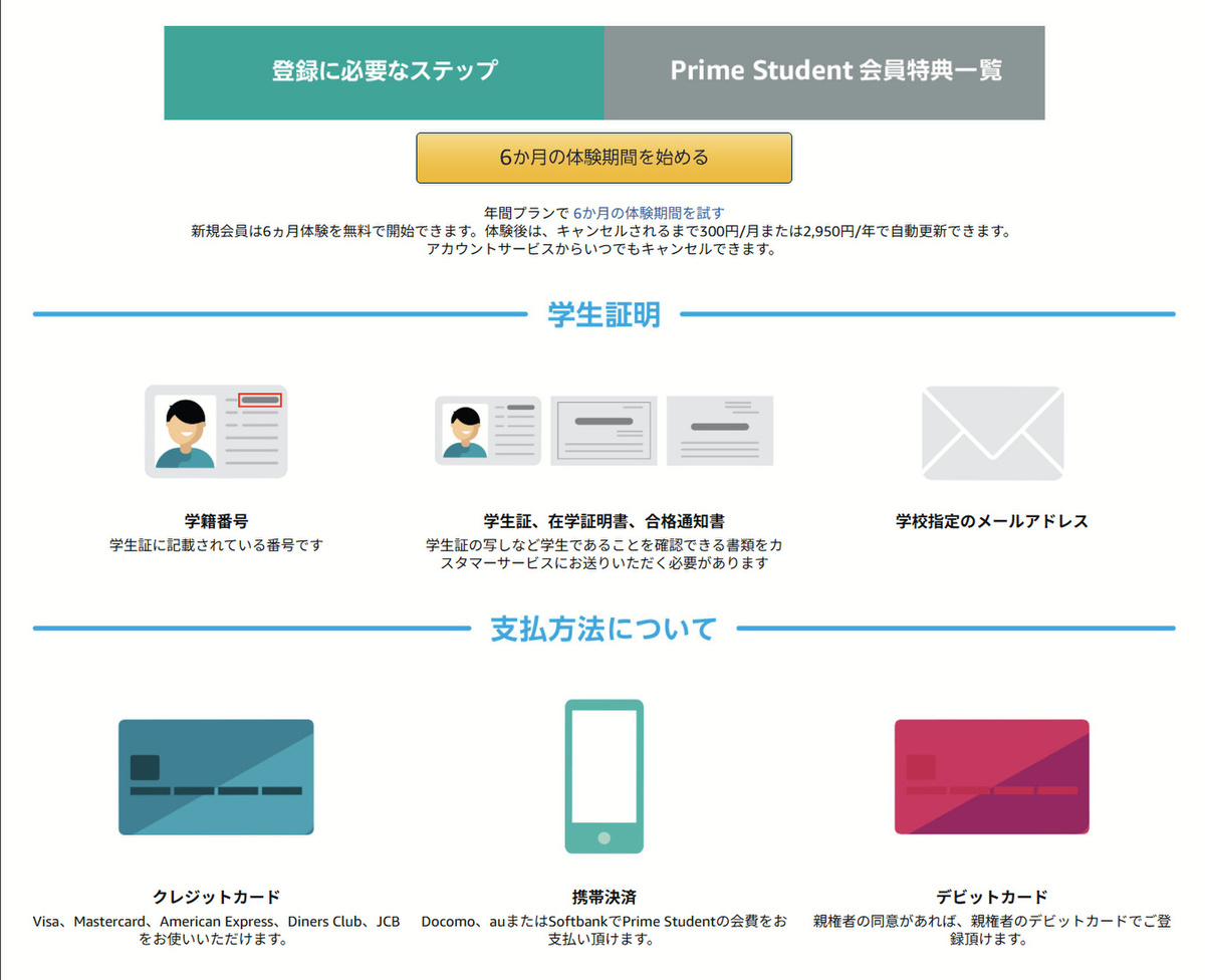 「Prime Student」は、Amazonが提供する学生向けの有料会員プログラム。年額2950円または月額300円(どちらも税込)で登録できます。通常のAmazonプライムとの大きな違いは、Prime Studentの対象者は日本国内の大学、大学院、短期大学、専門学校、高等専門学校に在籍する学生に限るという点です。