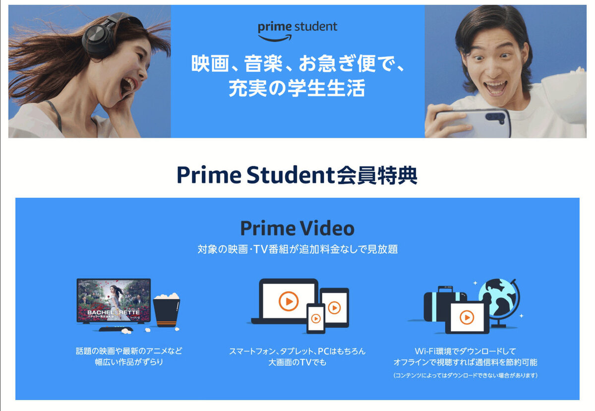 2026年4月時点でAmazonプライムは年額5900円、月額600円(どちらも税込)ですから、基本的には「Amazonプライムがほぼ半額で使えるようなもの」と考えれば良いでしょう。ただし、学生向けですから卒業後は使えません。そして中高生は対象外ですので注意しましょう。