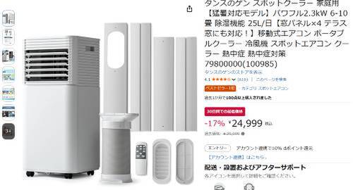 タンスのゲンの「スポットクーラー 家庭用(2.3kW/猛暑対応モデル)」がAmazonで割引対象。過去価格29,999円のところ、17%オフの24,999円で販売中。