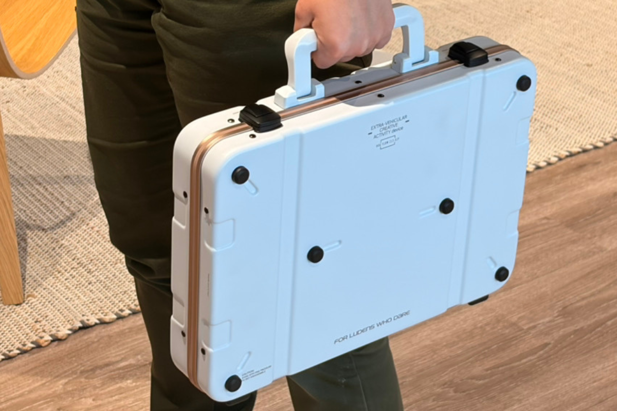 本機をいかにも近未来ガジェットたらしめている最後のパーツは、これまた本機のためだけにデザインされた専用ハードケースです。他の周辺機器は別売なのに、このケースだけは、「こいつを運ぶのに、そこらで売ってるふつうのPCケースなんかに入れないで!」という開発陣の主張の圧が感じられる製品同梱仕様。