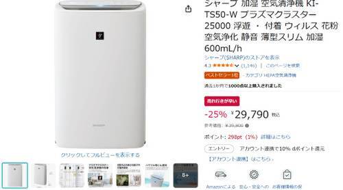 【Amazonで25%オフ】シャープ「加湿 空気清浄機 KI-TS50-W」をチェック!