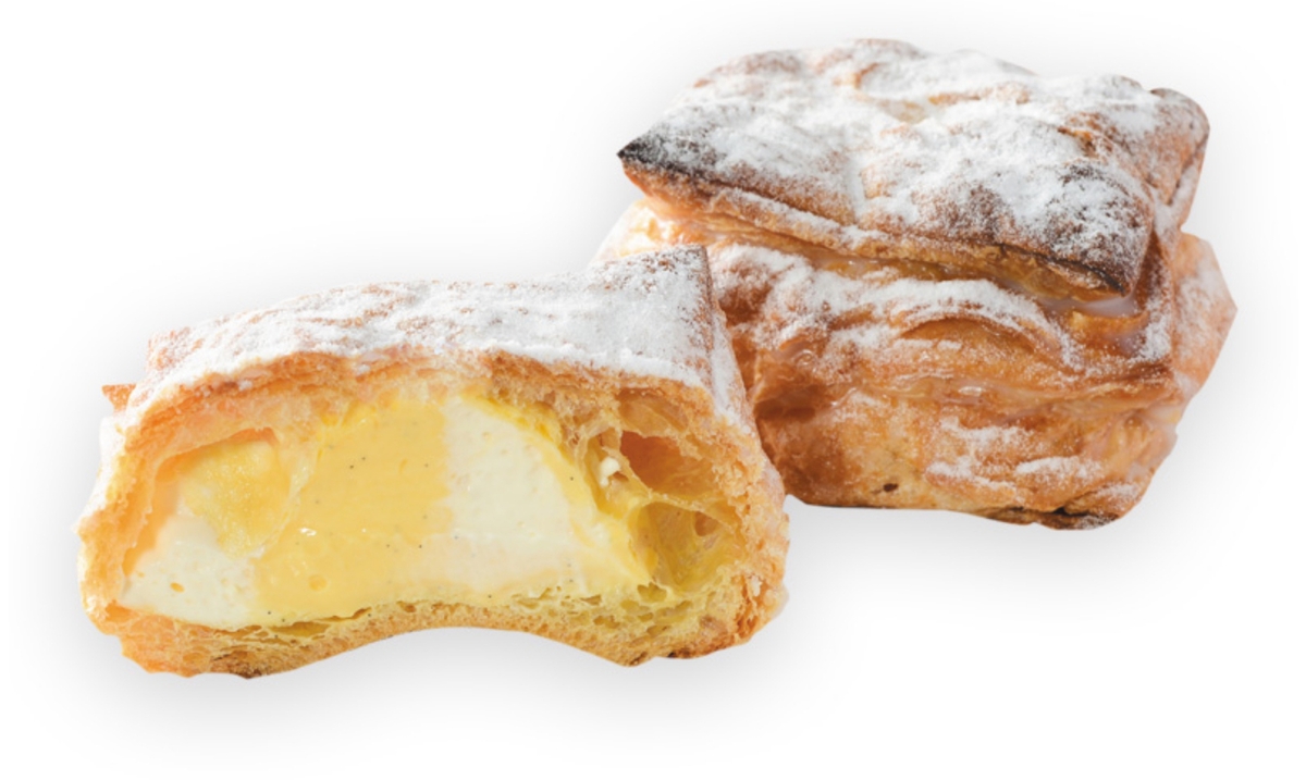 ダマンド生地にカスタードホイップとカスタードムースを重ね、内部にカスタードソースを入れた構成です。