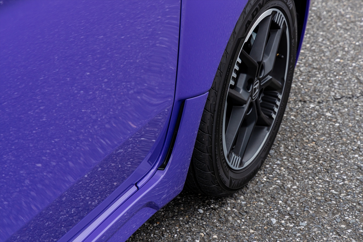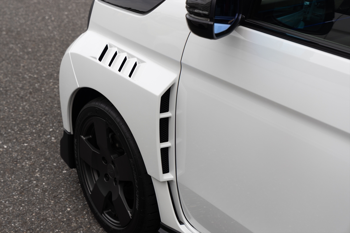 N-ONE :eとの変更点は大きく2つ。ひとつはワイドトレッド&幅広タイヤの採用でグリップ力が向上したということ。具体的にはサスペンションアームを5cm伸ばしたそうで、それに伴い軽自動車規格ではなく、5ナンバーサイズとなってしまいましたが、大きく張り出したオーバーフェンダーがカッコイイのでヨシとしましょう。