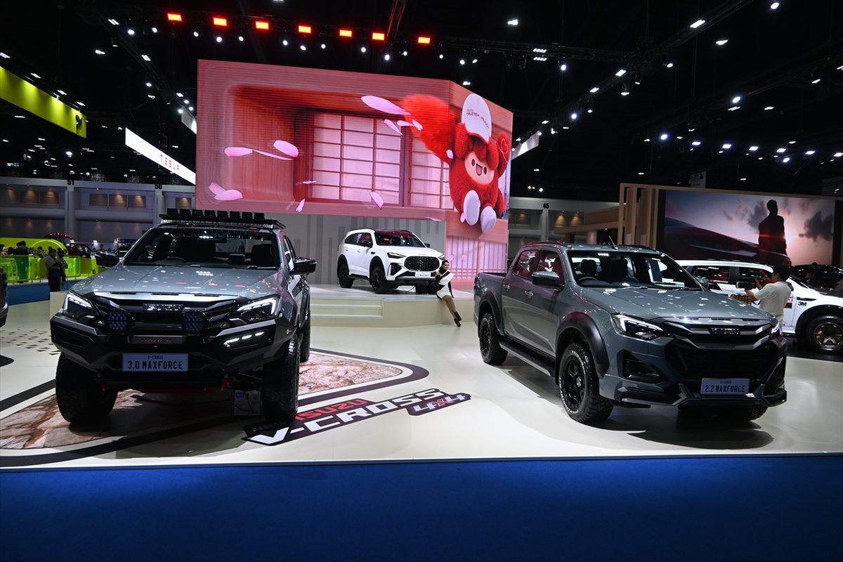 そして、最後にいすゞは、ピックアップトラックの「D-MAX V-CROSS」と、そのSUV版となる「MU-X」の2台をメインステージに。また、EV化されたピックアップトラック「D-MAX EV」も展示されていました。レーシングカー風カスタムの「D-MAX」や、ゆるキャラのマスコットキャラクターを用意するなど、楽し気な雰囲気が印象的でした。