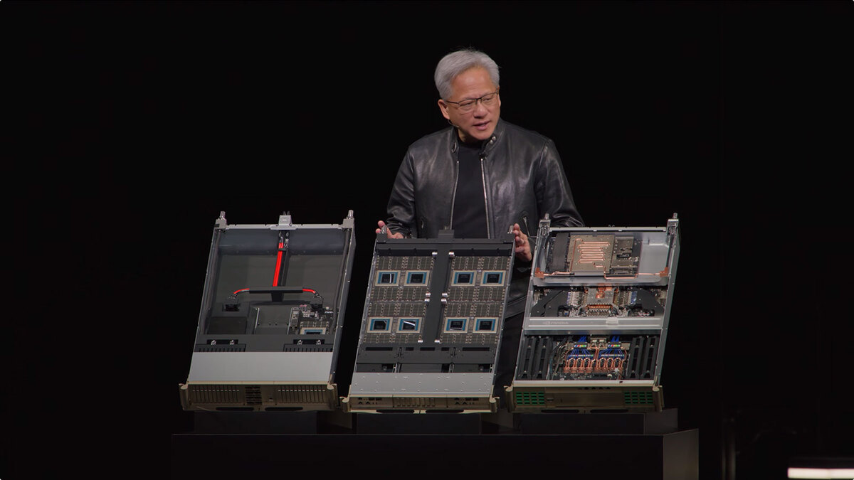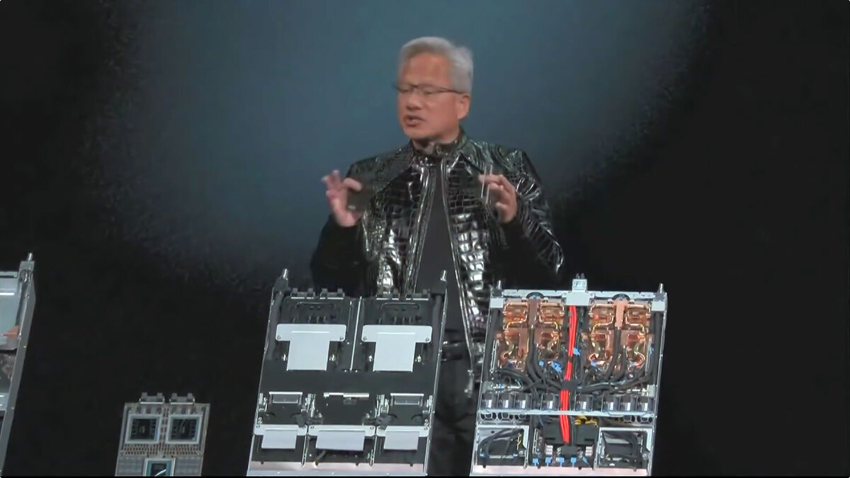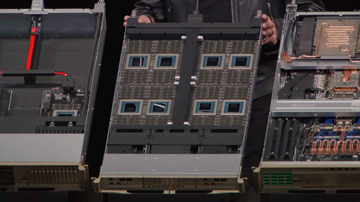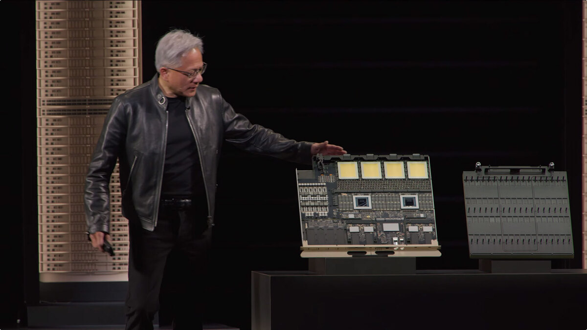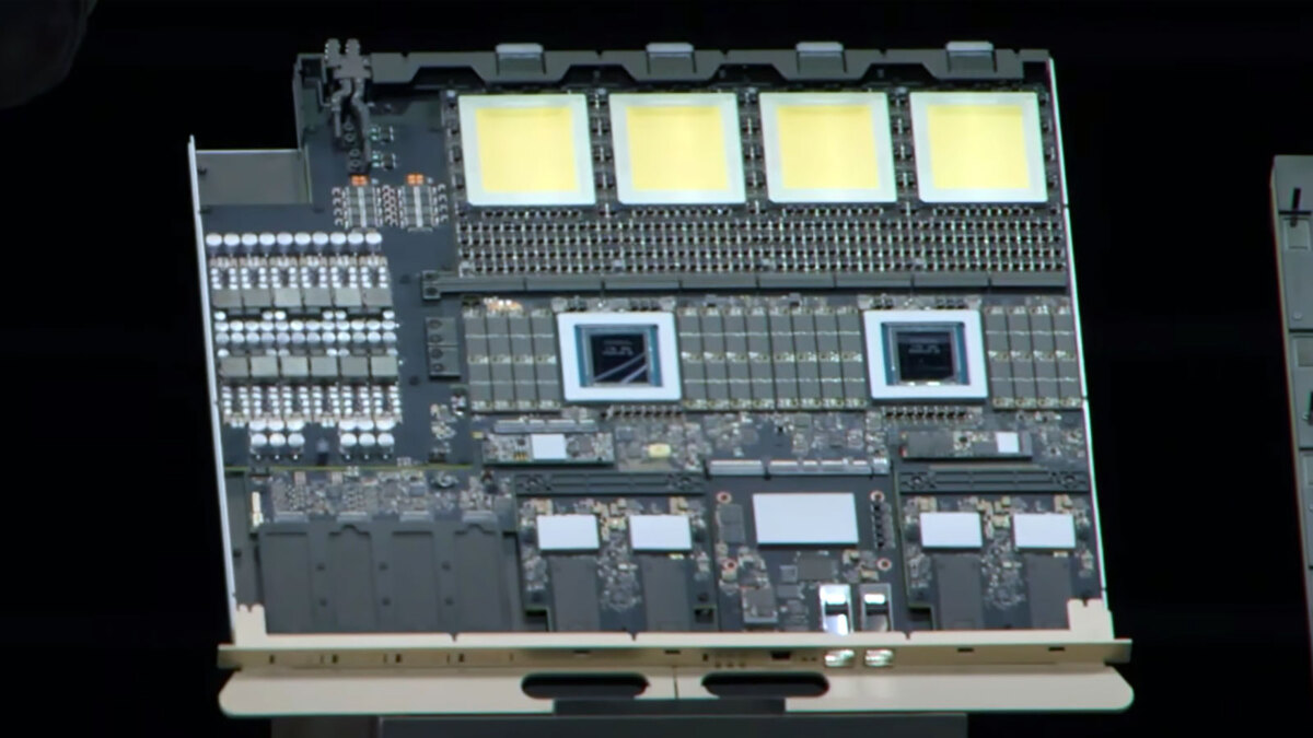 これに対しRubin UltraではRubin Ultra×2+Vera×2を1枚の基板に載せる格好になっていると説明された。下の画像は別アングルのものを切り出して拡大したものだが、基本横長になっているのがわかる。