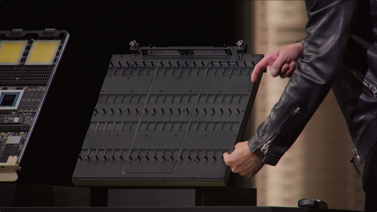 GTC 2026で公開されたMidplane。おのおののコネクターの接点数がいくつかは判別できなかった。152ピンよりは多そうに思える。中央に走る溝は冷却系にも見えないのだが、機械的強度確保用のフレームだろうか?