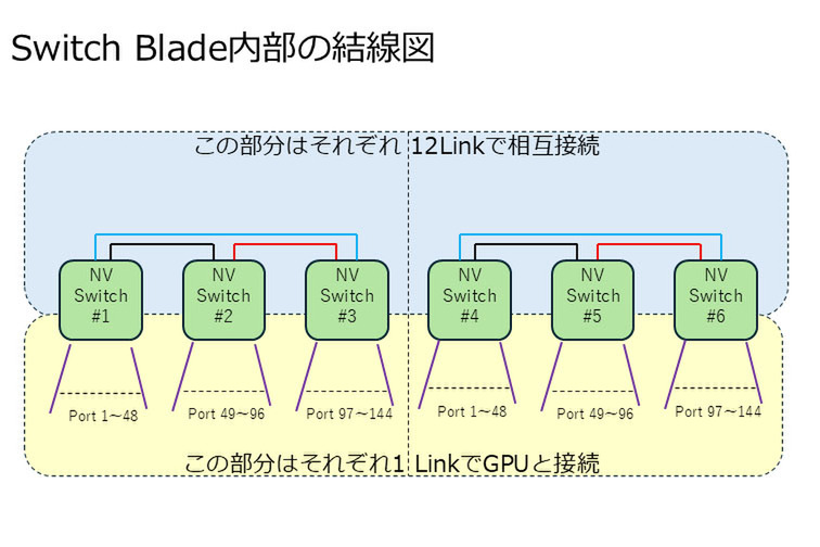 さて、そうなるとSwitch Blade内部(Switch Bladeの写真でカバーが隠れている部分)はどうなっているのか? だが、3つのNVSwitchを組み合わせて144ポートのスイッチを構築するという下図のような構成になっているものと考えられる。2つの基板の間をさらに大量の配線で相互接続することは不可能ではないと思うが、そこまでやる必要もなさそうだからだ。